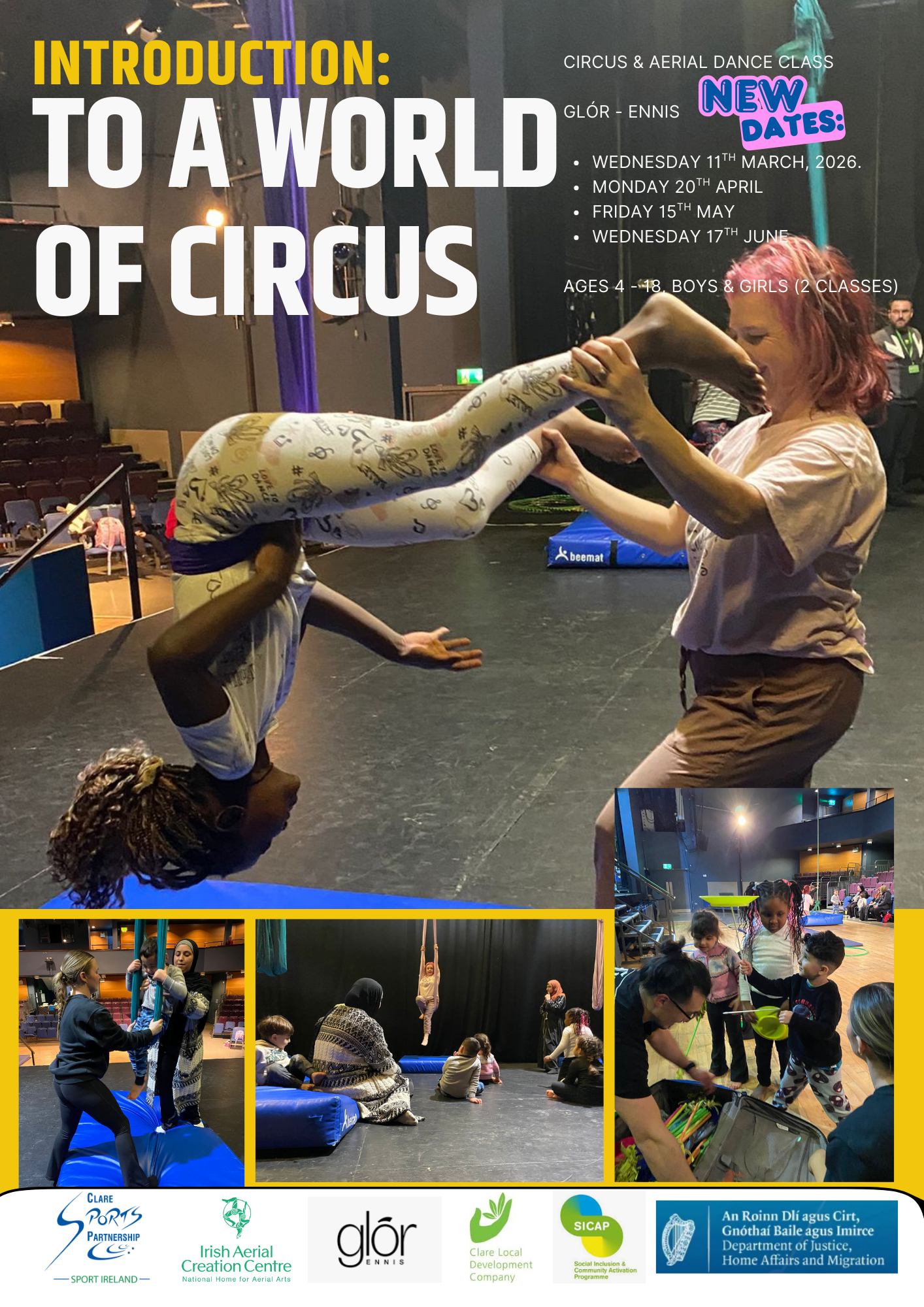 Join us again on Wednesday 11th March to participate in an Introduction to Circus, Aerial Dance and Creativity! In Glór in Ennis Town.