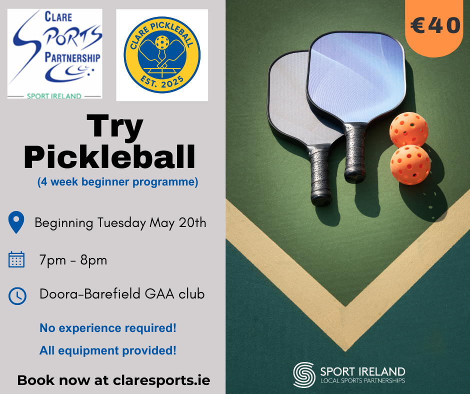 Clare Sports Partnership are delighted to launch a NEW Pickleball Beginners Programme in conjunction with the newly established Clare Pickleball club! If you have ever wanted to try pickleball this is the perfect stepping stone for you. This social programme is open to those new to the sport and those who have played before but want to get back to playing!