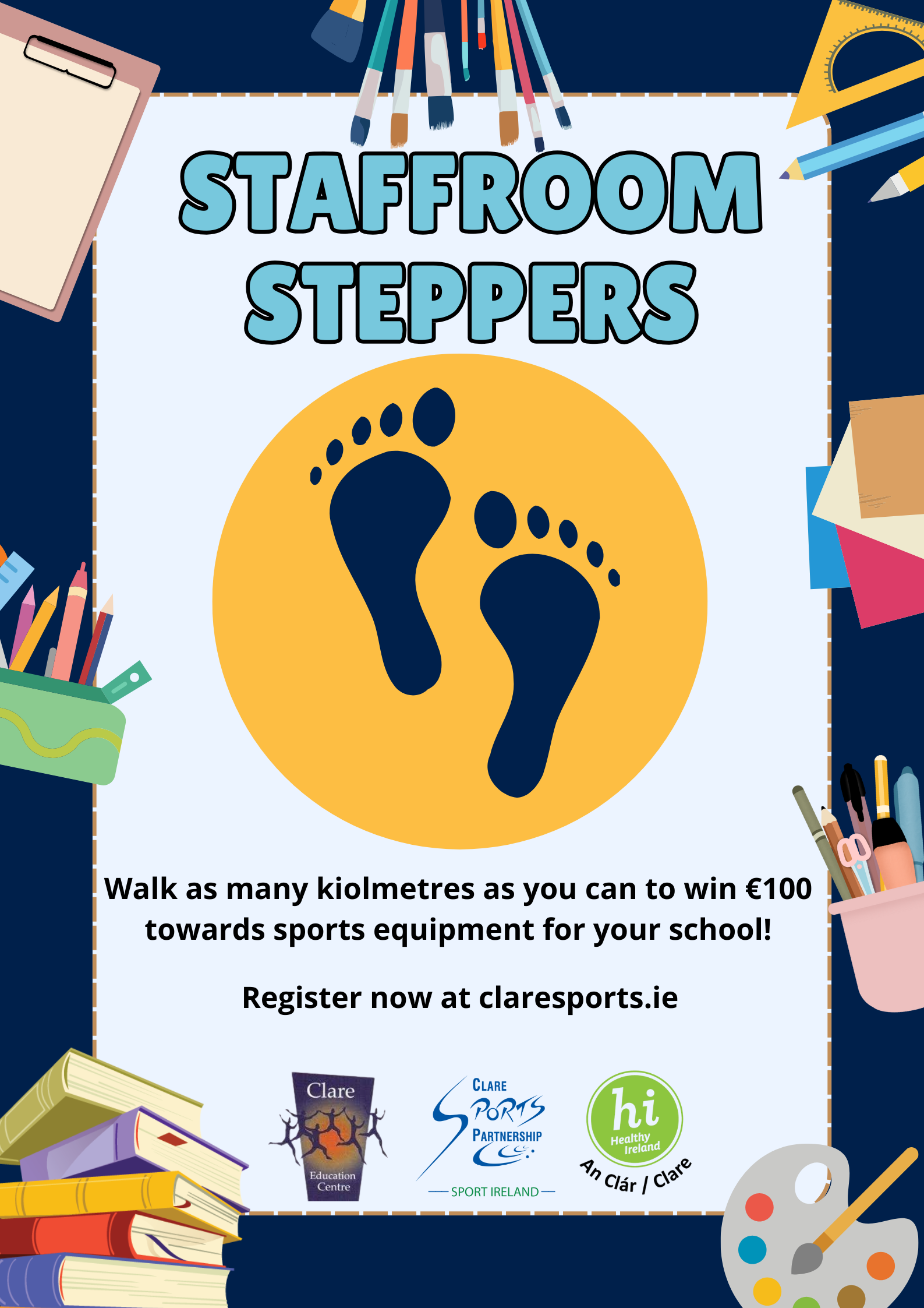 Clare Sports Partnership, Clare Education Centre, and Healthy Clare are teaming up to launch an exciting new initiative for primary school staff across County Clare — the Staffroom Steppers Challenge! This challenge is a fun and healthy way to get active, connect with colleagues, and show your school spirit!